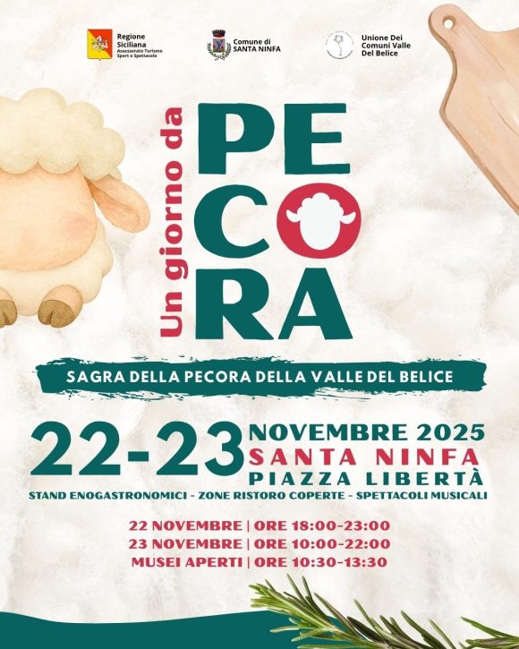 Carne di pecora e poi tutti i derivati dal latte dell’ovino: ricotta e formaggi, compresa la Vastedda del Belìce, l’unico formaggio con latte di pecora a pasta filata. Questo e tant’altro si potranno degustare nel week-end del 22 e 23 novembre a Santa Ninfa in occasione di “Un giorno da pecora”, l’iniziativa promossa dal Comune e giunta quest’anno alla undicesima edizione. Come già lo scorso anno la festa si svolgerà in due giorni: si inizia nel pomeriggio di sabato (ore 18) con l’inaugurazione degli stands in piazza Libertà e in via G. Garibaldi per poi continuare nella giornata di domenica con le degustazioni che si svolgeranno di mattina e pomeriggio (ore 10-22). Sabato sera anche spazio alla musica col concerto gratuito di Alberto Urso, il cantautore, tenore e polistrumentista messinese, vincitore della diciottesima edizione del talent show “Amici” di Maria De Filippi. Protagonista indiscussa sarà, però, la pecora del Belìce. Si tratta di una razza ovina le cui origini risalgono a ripetuti incroci tra ovini di razza Pinzirita, Comisana e Sarda e al successivo meticciamento selettivo e riproduzione in consanguineità. La particolarità di questa razza è data dalla produzione di un latte molto adatto all’industria casearia. Infatti è ricco di materia grassa e di proteine ed è particolarmente adatto alla filatura. Questa sua caratteristica, infatti, consente la produzione della “Vastedda della Valle del Belìce”, un formaggio a pasta filata interamente prodotto da latte ovino che porta il marchio Dop ed è anche un Presidio Slow Food.