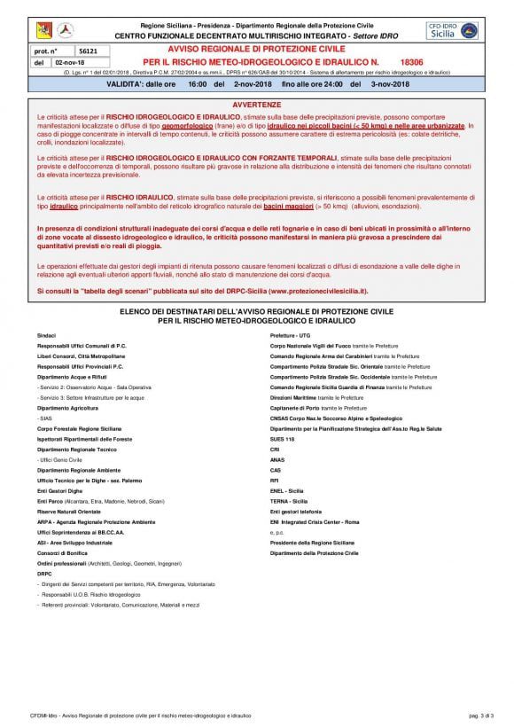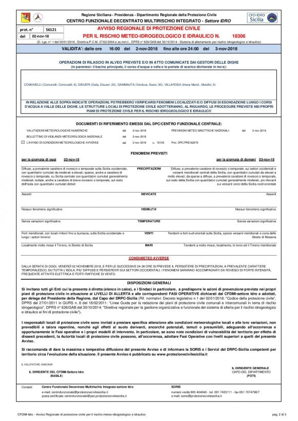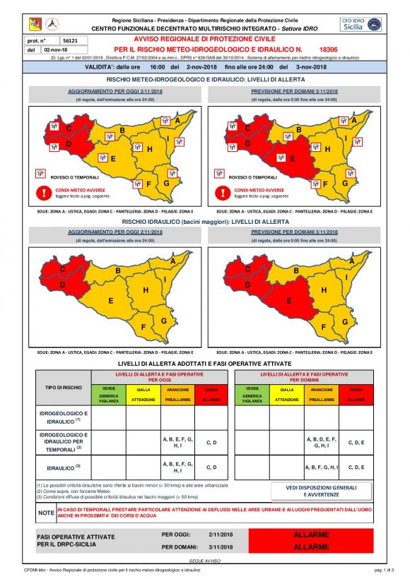 CONDIZIONI METEO AVVERSE: DALLA SERATA DI OGGI, VENERDÌ 02 NOVEMBRE 2018, E PER LE SUCCESSIVE 24-36 ORE SI PREVEDE IL PERSISTERE DI PRECIPITAZIONI, A PREVALENTE CARATTERE TEMPORALESCO, SU TUTTA L’ISOLA, PIU’ DIFFUSE E PERSISTENTI SUI SETTORI OCCIDENTALI.