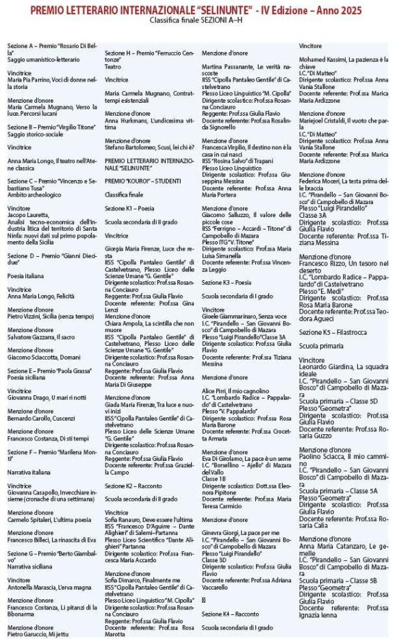 Cerimonia di premiazione, al teatro Selinus di Castelvetrano, per la 4a edizione del “Premio letterario Internazionale Selinunte”. Quest’anno accanto ai riconoscimenti già intitolati a Rosario Di Bella (saggio umanistico-letterario), Vincenzo e Sebastiano Tusa (ambito archeologico), Gianni Diecidue (poesia in lingua italiana), Paola Grassa (poesia in lingua siciliana) e Ferruccio Centonze (testo teatrale), si sono aggiunti i premi dedicati a Virgilio Titone (saggio storico-sociale), Marilena Monti (narrativa italiana) e Berto Giambalvo (narrativa siciliana), rendendo l’offerta culturale ancora più articolata. Quasi 200 sono stati i concorrenti di quest’anno che hanno preso parte alle otto sezioni dedicate agli scrittori di maggiori d’età, con elaborati provenienti anche da Sardegna, Lazio, Campania, Liguria e Lombardia, e le cinque sezioni riservate agli studenti, che hanno visto la partecipazione di numerosi istituti da varie parti della Sicilia. Il Premio è stato patrocinato (gratuitamente) da: Fondazione Sebastiano Tusa, Arcipretura di Castelvetrano, Comuni di Castelvetrano, Campobello di Mazara e Partanna, Parco archeologico di Selinunte. Qui di seguito l’elenco dei vincitori per le diverse sezioni.