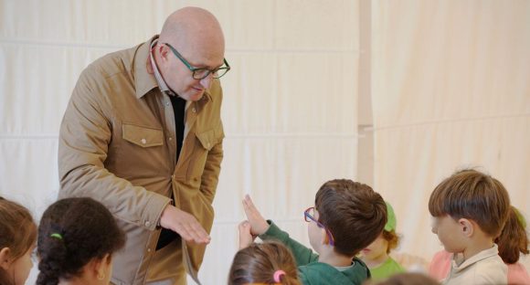L’assessore Mimmo Turano nella sua recente visita a Gibellina: qui nella foto mentre incontra alcuni bambini che hanno partecipato a un laboratorio artistico.