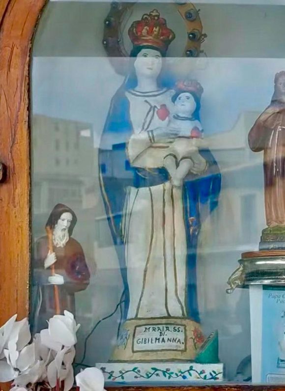 Con la nascita della borgata nel 1862, attorno alla cala e al vallone, il culto mariano non solo non scomparve, ma si rafforzò. Tra i rifugi di fortuna dei pescatori, sorse una fede che viveva nelle preghiere sussurrate sulle barche e nelle promesse fatte davanti al mare. Fu in questo contesto che accadde un fatto ancora oggi ricordato con rispetto e meraviglia: la nascita dell’edicola della Madonna di Gibilmanna. L’antica edicola della fine dell’Ottocento allo Scaro di Bruca, dedicata alla Madonna di Gibilmanna, è collocata nello sperone tra la fine della via Scalo di Bruca e l’inizio della via Usodimare. Pare che la sua origine si debba a marinai provenienti da Cefalù e Porticello, particolarmente devoti alla Madonna di Gibilmanna. Si racconta che l’attuale statuetta fosse una delle tante poste a prua delle barche, a protezione delle traversate. In un periodo di scarso pescato, uno dei pescatori, esasperato dalla fatica e dalla fame, in un impeto di rabbia bestemmiò e scagliò in mare la statuetta della Madonna. Fu un gesto grave, quasi un tradimento spirituale, una ferita nel legame sacro che unisce i marinai alla loro Patrona.
