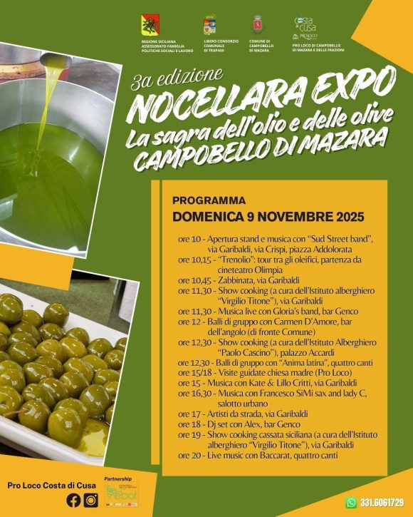 Protagonista, oltre l’olio, sarà la Nocellara del Belìce, l’oliva cultivar che viene coltivata nel territorio compreso tra Campobello, Castelvetrano e Partanna. Durante le due giornate – sabato e domenica – ci sarà anche musica con gruppi locali, street band e balli di gruppo con Unione Latina e Carmen D’Amore. Domenica ci sarà anche spazio per le degustazioni organizzate dagli Istituti alberghieri “F. Paolo Cascino” di Palermo e “Virgilio Titone” di Castelvetrano. Tra gli espositori anche l’Ebat, l’Ente bilaterale agricolo territoriale.