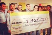 I 15 eletti del Movimento Cinque Stelle, rinunciano ai rimborsi elettorali delle regionali, ma sbagliano i conti. Ecco la foto del mega-assegno esibito soltanto per poco tempo ai fotografi e poi subito ritirato.