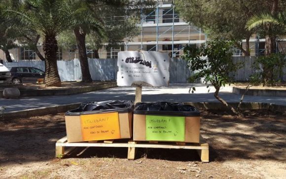 Ma non finisce qui. Con una pedana in legno ed alcuni cartoni trovati nella piazza, i ragazzi hanno realizzato un piccolo angolo di raccolta rifiuti con tanto di cartello.