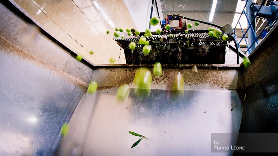 un altro particolare delle olive che si “tuffano” nella lavatrice