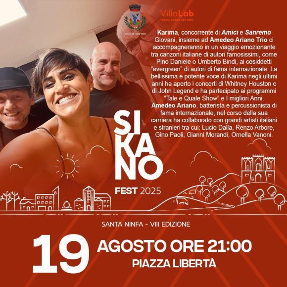Nell’ambito del “Sikano fest 2025”, questa sera (martedì 19), ore 21, in piazza Libertà a Santa Ninfa si esibirà Karima insieme ad Amedeo Ariano Trio in Life time. Un viaggio musicale emozionante tra canzoni italiane di autori famosissimi, come Pino Daniele o Umberto Bindi, e i cosiddetti “evergreen” di autori di fama internazionale. La bellissima e potente voce di Karima negli ultimi anni ha aperto i concerti di Whitney Houston e di John Legend e ha partecipato ai programmi “Tale e Quale Show” e “I migliori anni”. Amedeo Ariano, batterista e percussionista di fama internazionale, nel corso della sua carriera ha collaborato con grandi artisti italiani e stranieri tra cui: Lucio Dalla, Renzo Arbore, Gino Paoli, Gianni Morandi, Ornella Vanoni.