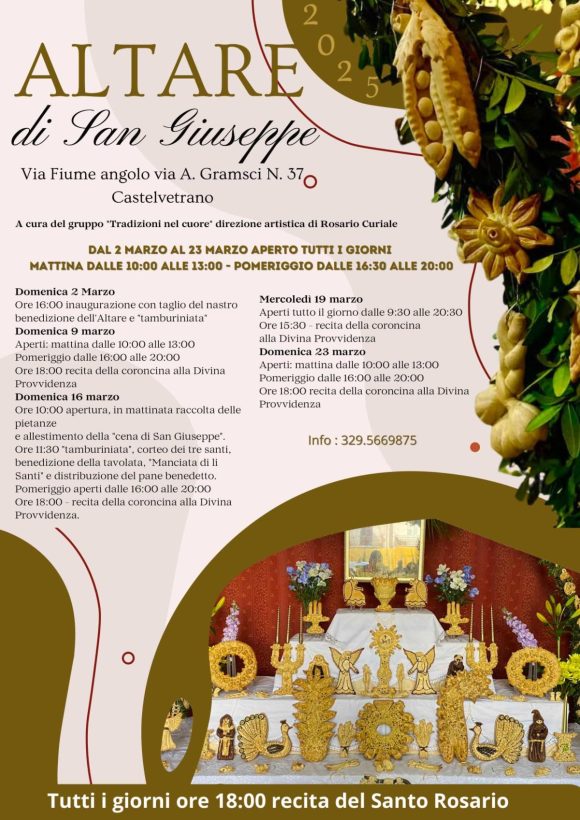 Si rinnova l’appuntamento in occasione di San Giuseppe. Il gruppo “tradizioni nel cuore” di Castelvetrano ha allestito con fede e devozione il tradizionale altare nei locali di via Fiume angolo via A. Gramsci. “Il nostro intento – dichiara il direttore artistico, Rosario Curiale – è quello di trasmettere e mantenere vive le tradizioni belicine, affinché le memorie del nostro patrimonio artistico e culturale non vadano perdute. Siamo lieti di invitare tutti all’inaugurazione e benedizione dell’ altare di San Giuseppe che si terrà Domenica 2 Marzo alle ore 15:45”. L’altare sarà aperto alle visite tutti i giorni mattina dalle 10:00 alle 13:00 pomeriggio dalle 16:30 alle 20:00 fino al 23 Marzo, segue locandina con un programma dettagliato.