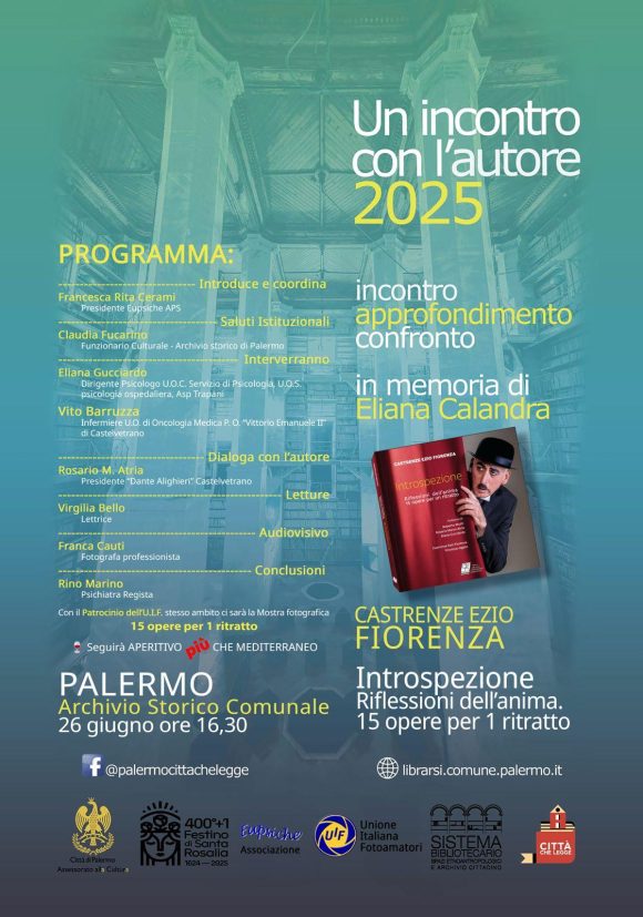 Giovedì 26 giugno, alle ore 16.30 presso l’archivio Comunale di Palermo, si terrà la presentazione del libro Introspezione – Riflessioni dell’anima – 15 opere per un ritratto di Castrenze Ezio Fiorenza. L’iniziativa si inserisce all’interno della manifestazione culturale dal titolo “Un incontro con l’autore” indetta dall’Archivio storico comunale di Palermo (area della cultura, turismo, sport e politiche giovanili – ufficio biblioteche e spazi etnoantropologici) e dedicata alla memoria di Eliana Calandra, presso la Sala Almeyda, dall’8 maggio al 10 luglio, al fine di valorizzare l’importanza della lettura come strumento di forza e consapevolezza, con un confronto diretto con gli autori, in particolare con studiosi, ricercatori e insegnanti che hanno consultato, approfondito e rielaborato il patrimonio documentale custodito presso gli istituti della cultura della città.