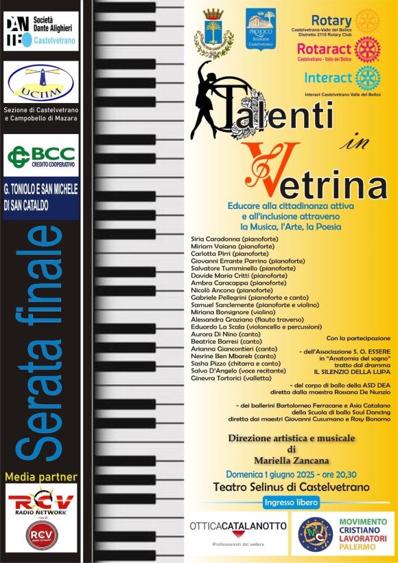 Si terrà domenica 1° giugno 2025 alle ore 20:30, presso il Teatro Selinus di Castelvetrano, la serata conclusiva della rassegna “Talenti in Vetrina”, manifestazione gratuita e aperta alla cittadinanza, nata per valorizzare i linguaggi della musica, dell’arte e della poesia come strumenti educativi e sociali, capaci di promuovere inclusione, partecipazione e cittadinanza attiva.