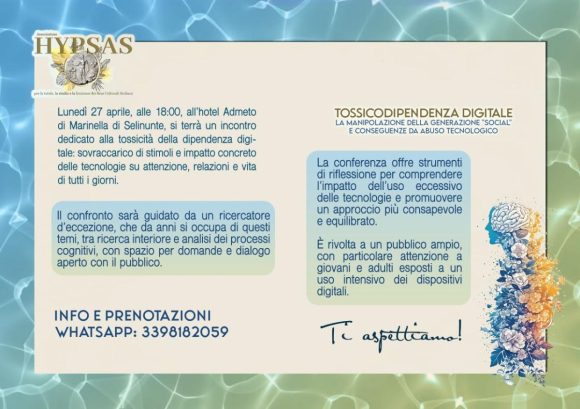 Lunedì 27 aprile alle 18 presso l’hotel Admeto a Marinella di Selinunte, si terrà un incontro dedicato alla dipendenza digitale, i temi trattati saranno il sovraccarico di stimoli e l’impatto delle tecnologie sull’attenzione e sulla vita di tutti i giorni,