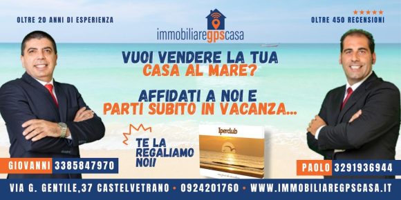 La novità? per chi decide di affidare il proprio immobile a Immobiliare GPS Casa, riceverà in regalo un soggiorno Iperclub in tutta Italia. L’offerta è disponibile solamente a chi affida in esclusiva la vendita della propria casa al mare per 15 mesi alla nota agenzia di Castelvetrano guidata da Giovanni Licari e Paolo D’Incerto Spina. Il Voucher Vacanza ti permette di prenotare una settimana fino a 4/5 persone, in Appartamento/Residence oppure in formula Hotel. E se l’agenzia non riesce a vendere l’immobile? La vacanza è comunque garantita poiché verrà consegnato il pacchetto vacanza subito! Chi si affida a Immobiliare Gps Casa, parte subito in vacanza senza attendere l’esito delle trattative. Su Google è disponibile un elenco con oltre 450 recensioni positive (5 stelle) lasciate dai clienti di Immobiliare Gps Casa.